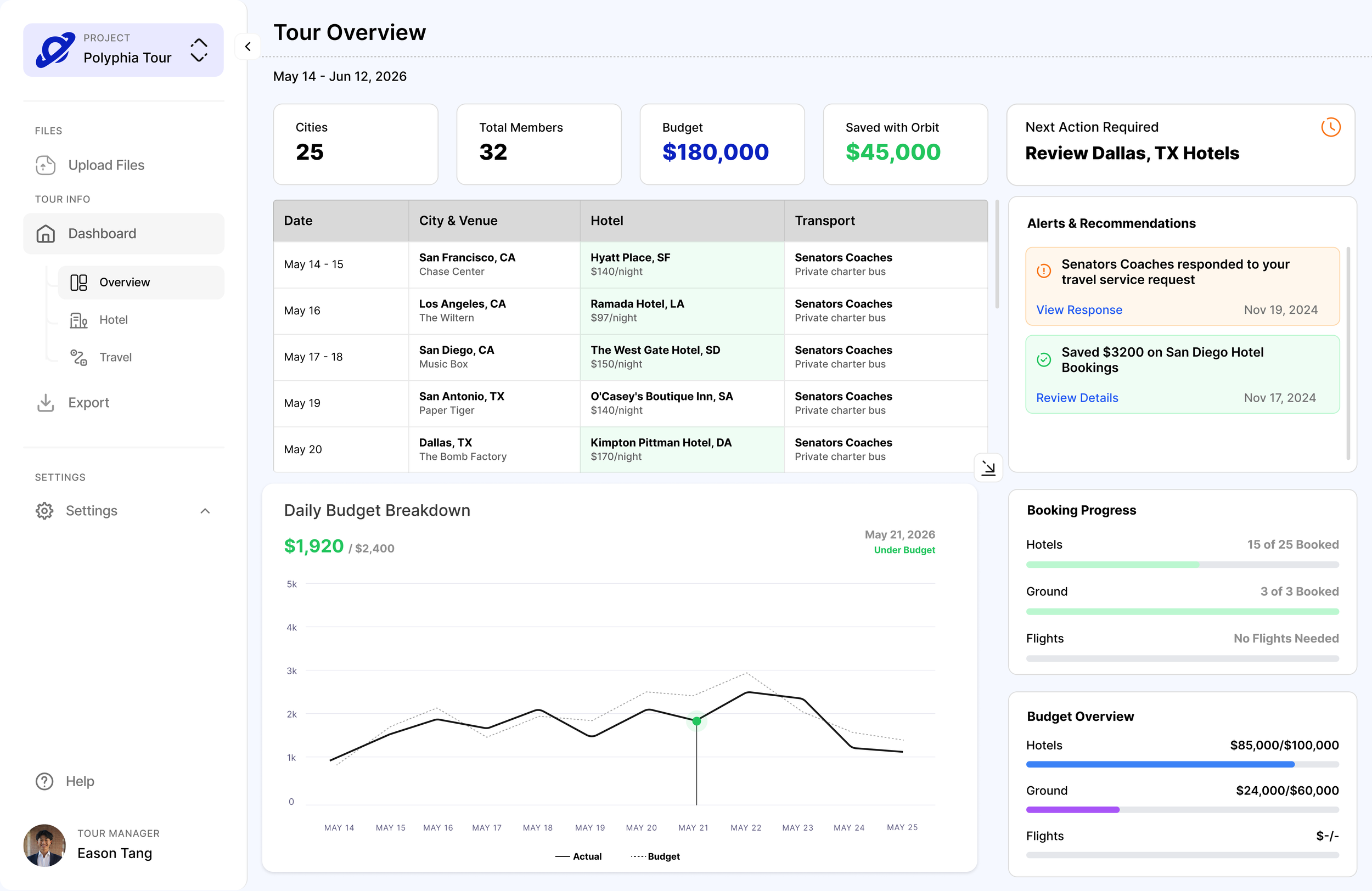 No more messy spreadsheets! Orbit’s comprehensive dashboard keeps track of all your touring information with live updates.